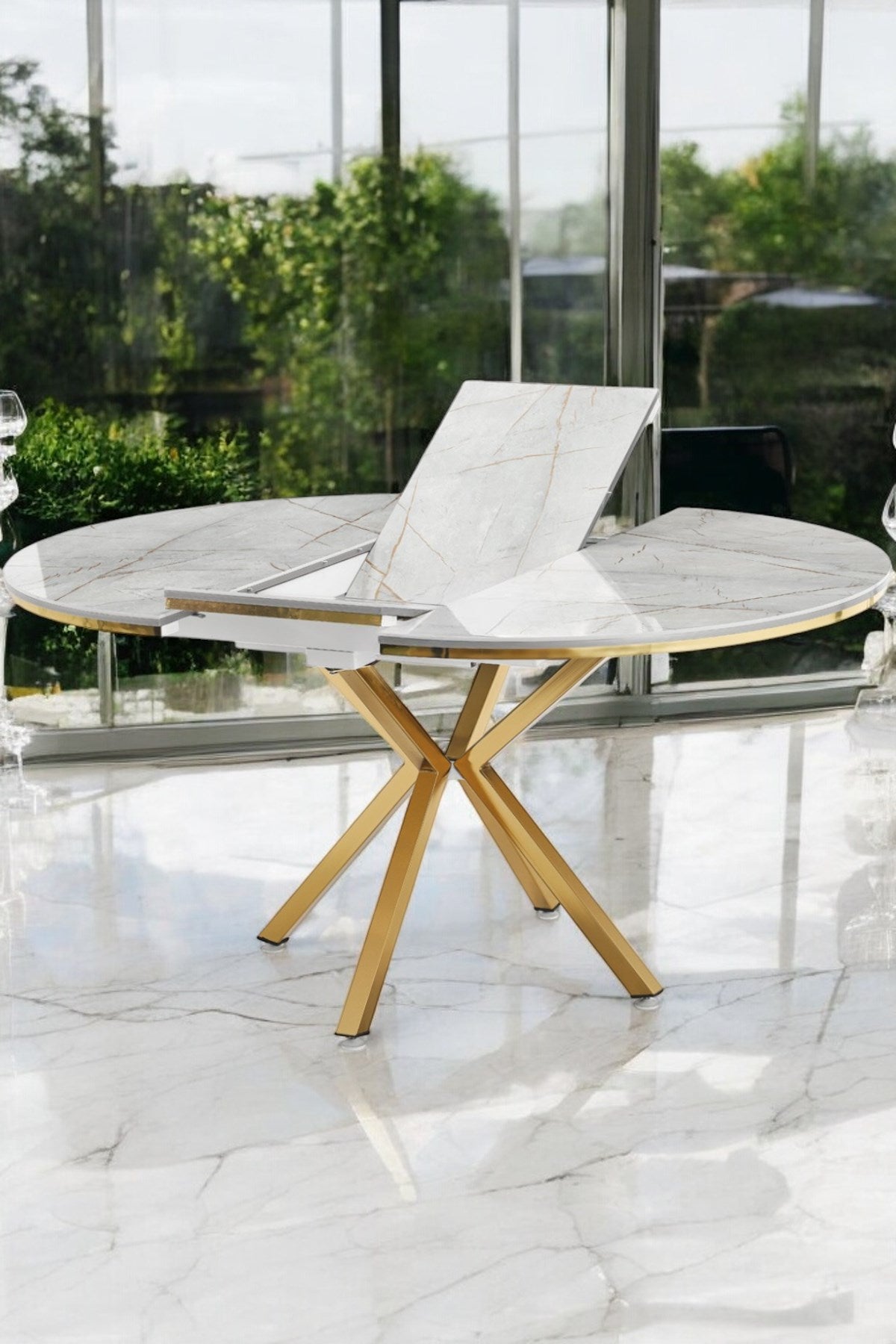Arhor Serisi 120x120 Açılabilir Lak Panel Beyaz Mermer Desen Masa Takımı Krem Sandalye