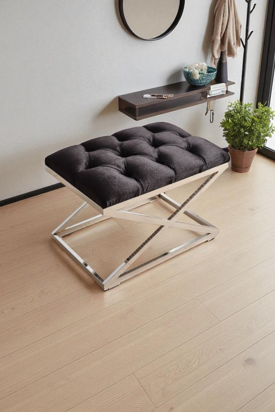 Ölçüler: 60x40 cm Ayak: Krom Metal X Ayak Kumaş: İthal Babyface Kumaş Dolgu: Yüksek Kaliteli Sünger