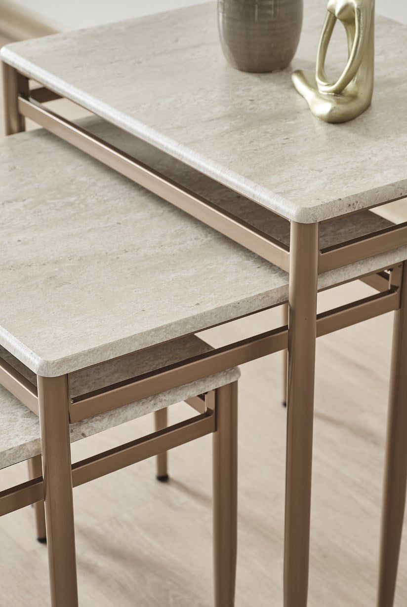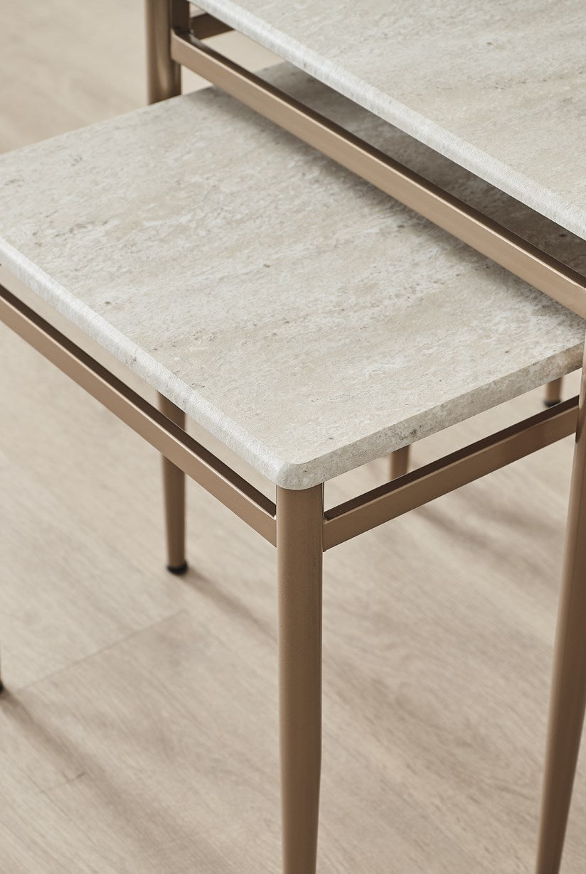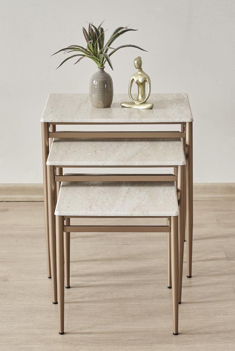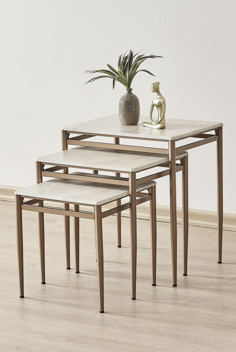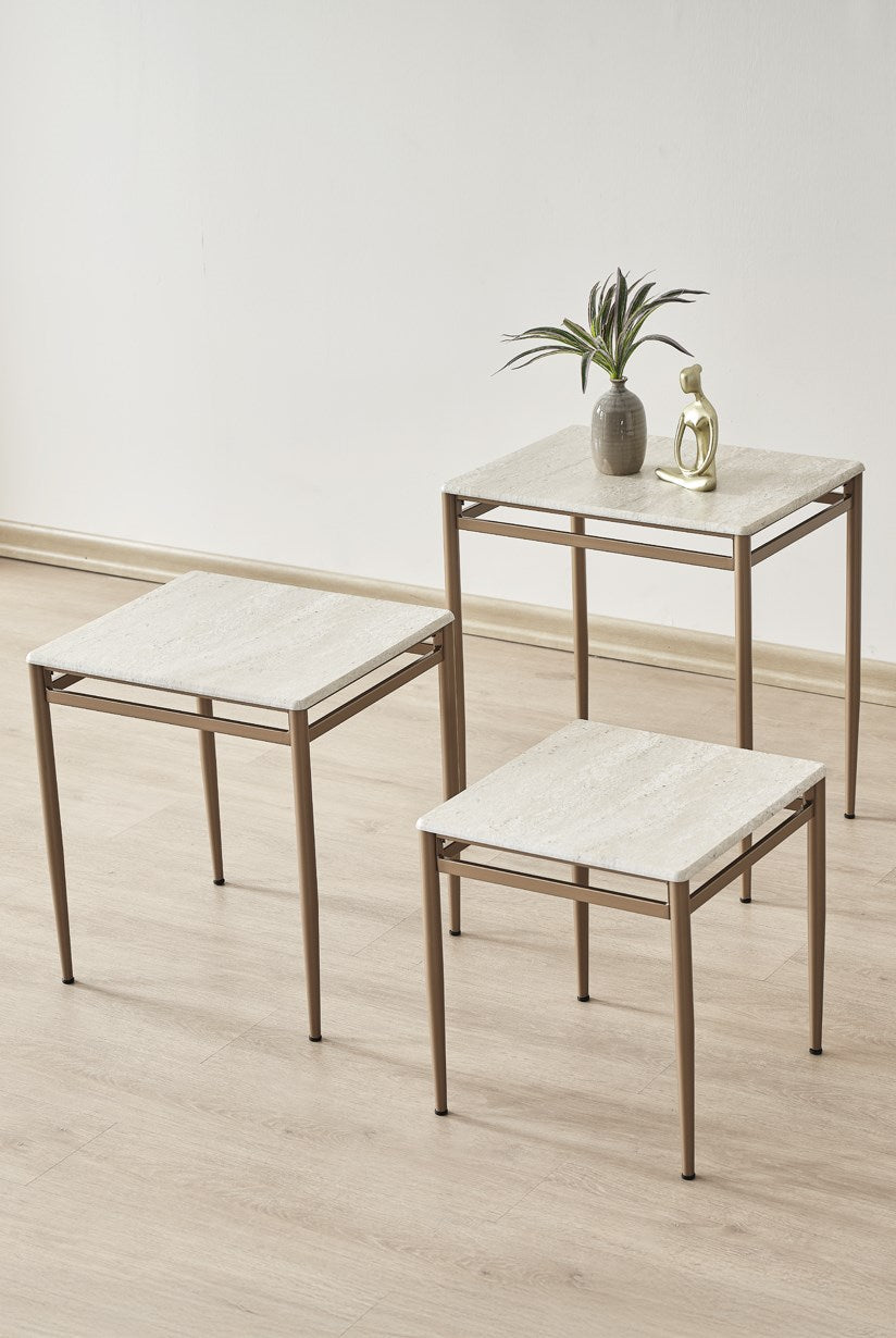 (Kopya) Damrin Traverten Desen & Bronz Ayak MDF Mebran Kaplama 3lü Zigon Sehpa