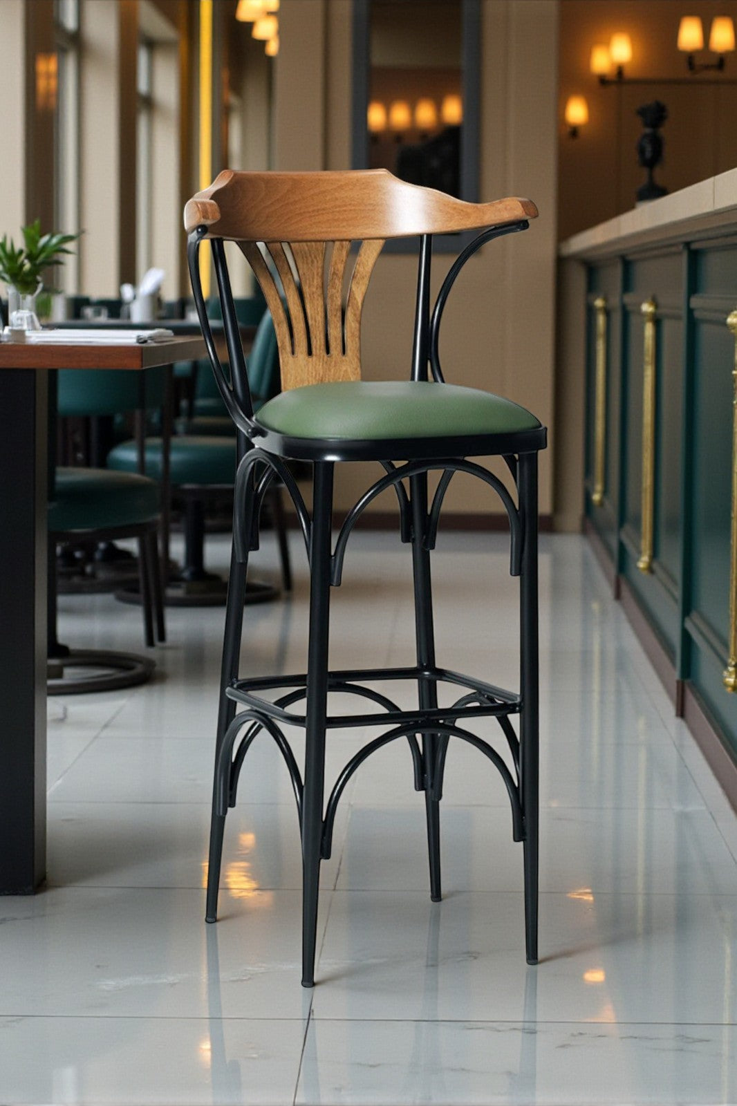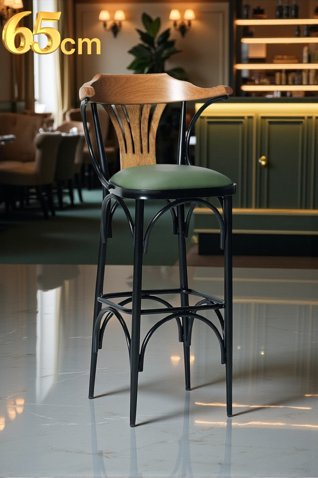 Vegas Serisi Ahşap Sırt Dayamalı Metal Ayaklı Yeşil Deri 65 CM Bar Sandalyesi