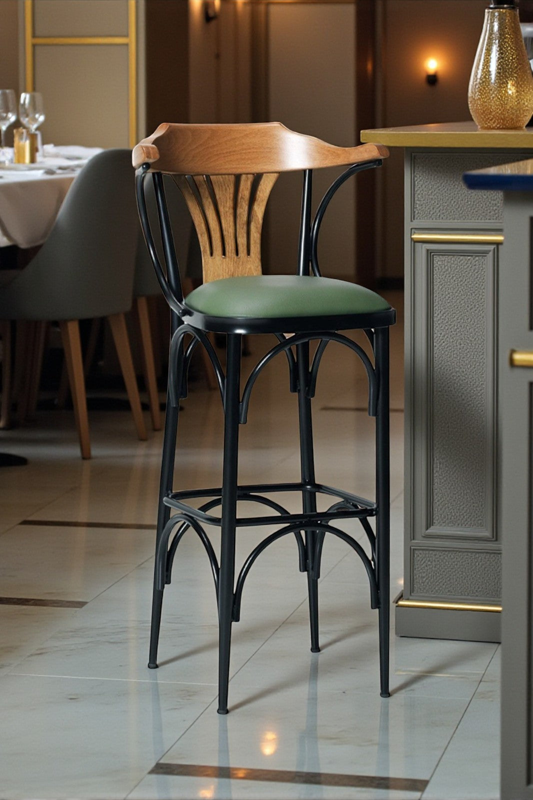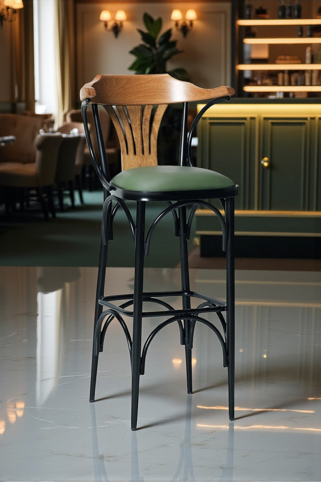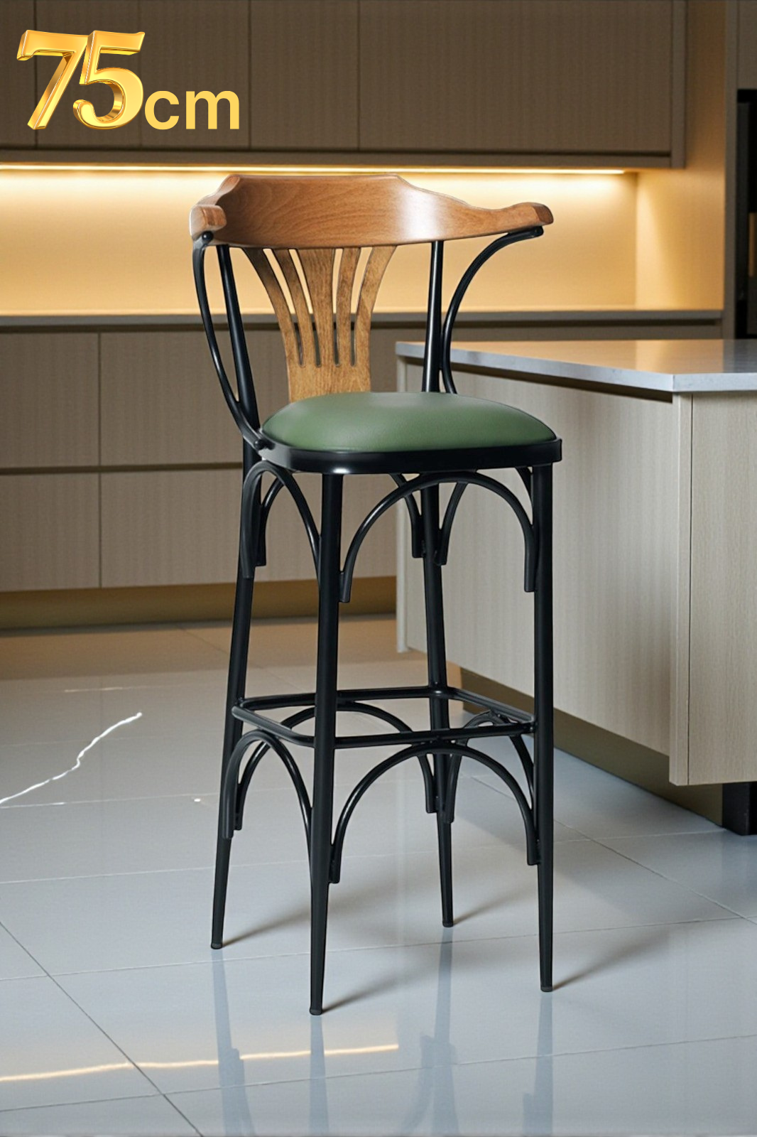 Vegas Serisi Ahşap Sırt Dayamalı Metal Ayaklı Yeşil Deri 75 CM Bar Sandalyesi