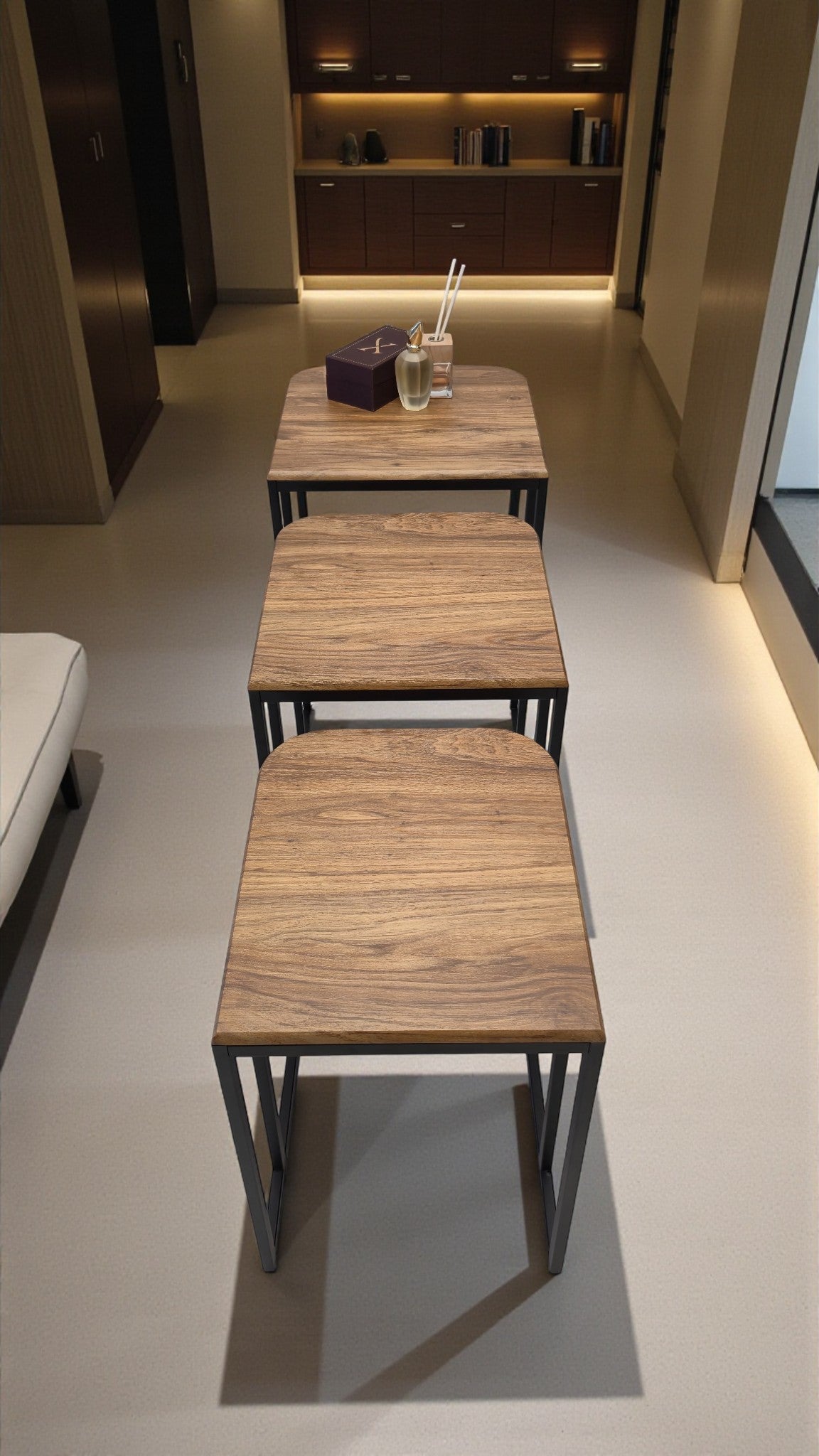 Toplam set yüksekliği farkı sehpalara iç içe geçebilme özelliği kazandırır ve alandan tasarruf sağlar